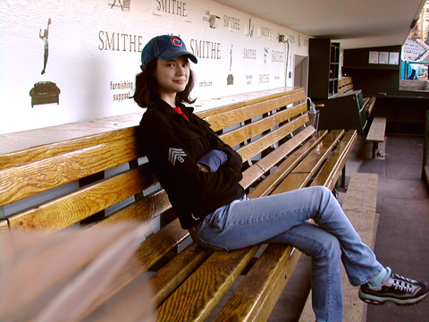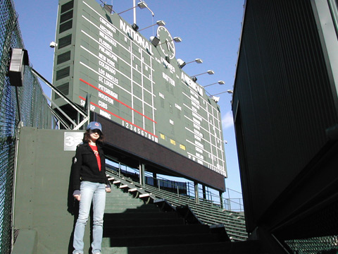 Me in front of the scoreboard, which is said to have never been hit by a fly ball.