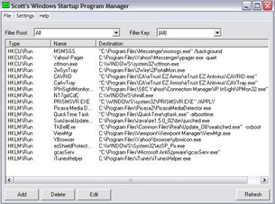 Delete the entries "CaAvTray" and "CAVRID" (assuming you're not using EZ Antivirus), then reset your computer. After that, see if you can uninstall EZFirewall. Also, I can't clearly read the entry above "PRISMSVR.EXE," but it looks like it might be spyware.