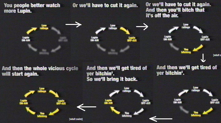 I love Lupin III. It's what made me stay up till the wee hours of the morn last summer. I don't now, cause those b******s took it off. When are they gonna put Lupin back on?