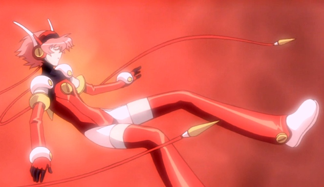 Scar (the Daimon for the day) attacks Makoto. Scar has a sheet over her, and takes it off the same way I person would when flashing somebody. XD